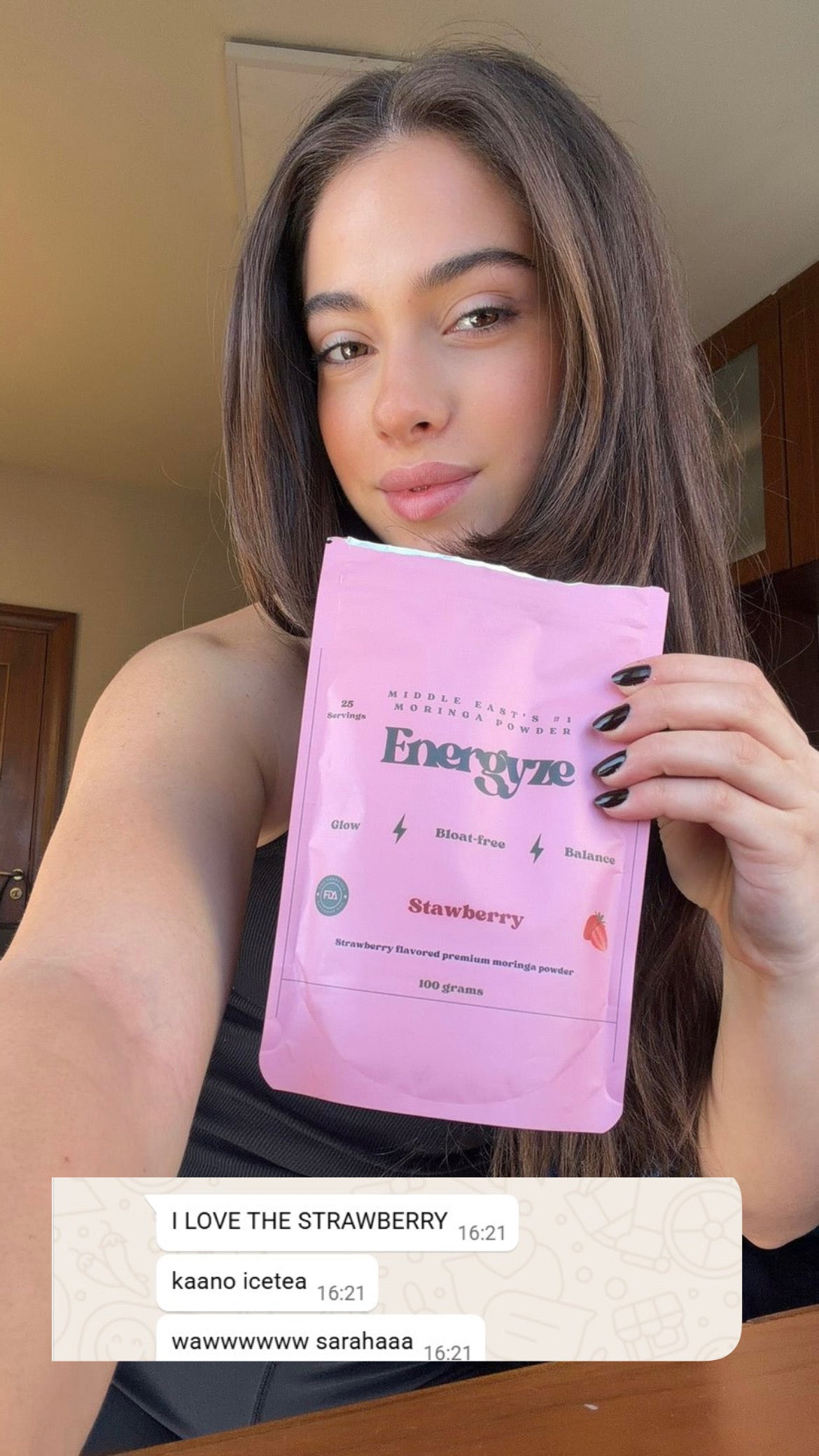 Cara atallah lebanese runner holding an Energyze bag in her hand