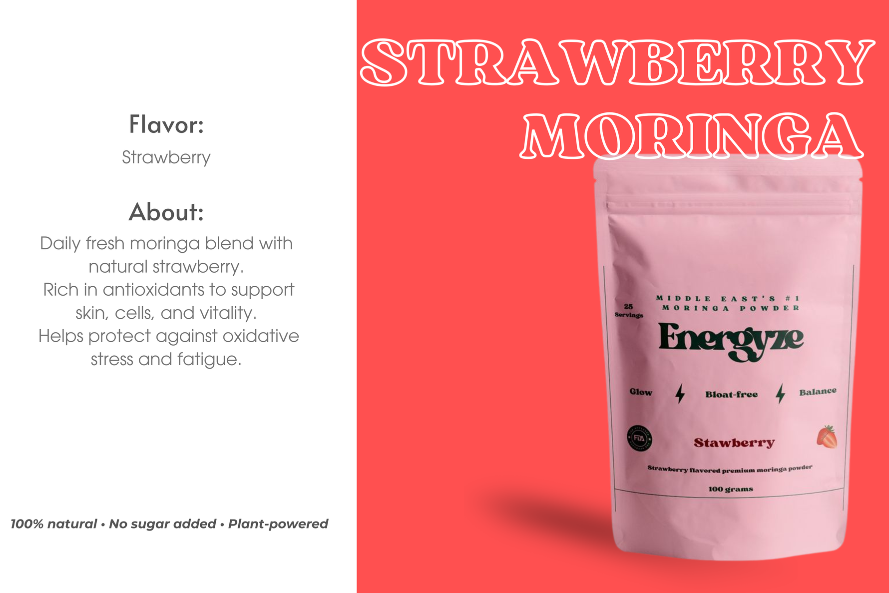 Made with real freeze-dried strawberry Mixed with 100% Natural Moringa